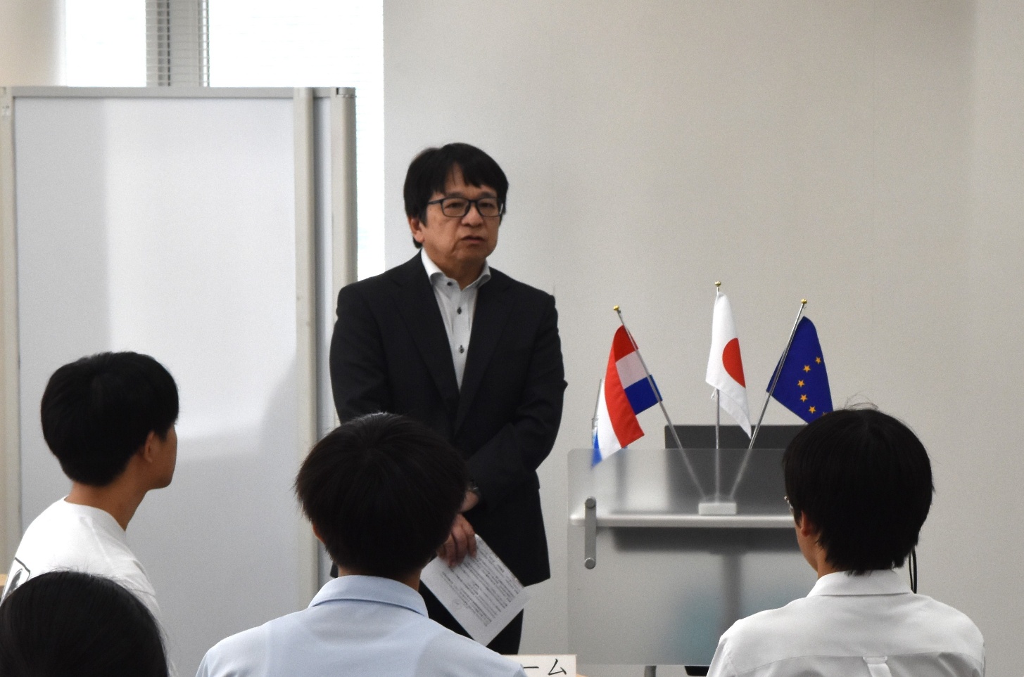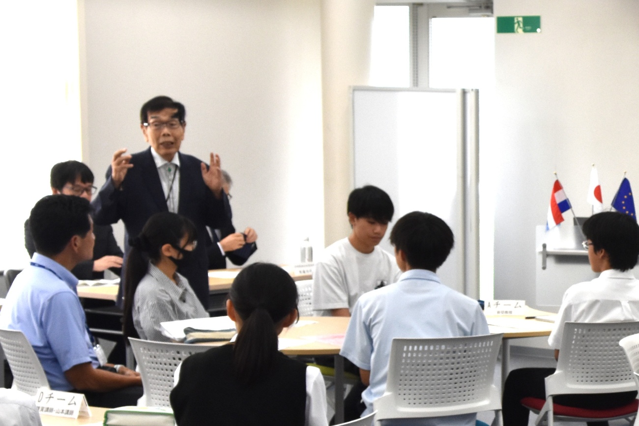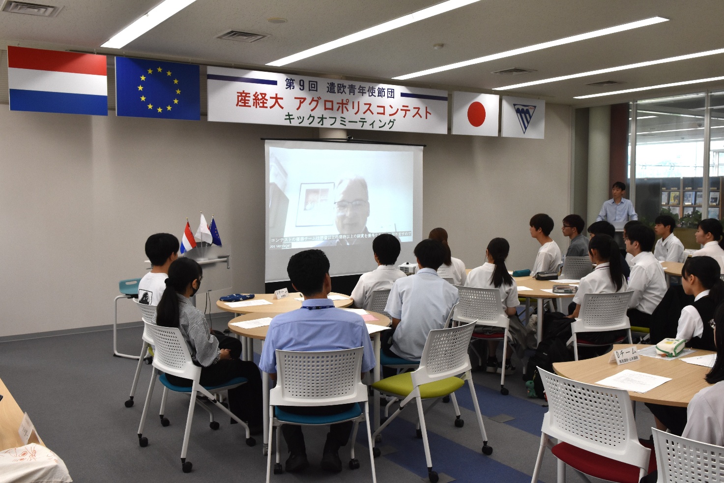 オランダ国立ワーゲニンゲン大学ジョス博士からのメッセージを聞き入る高校生・産経大生