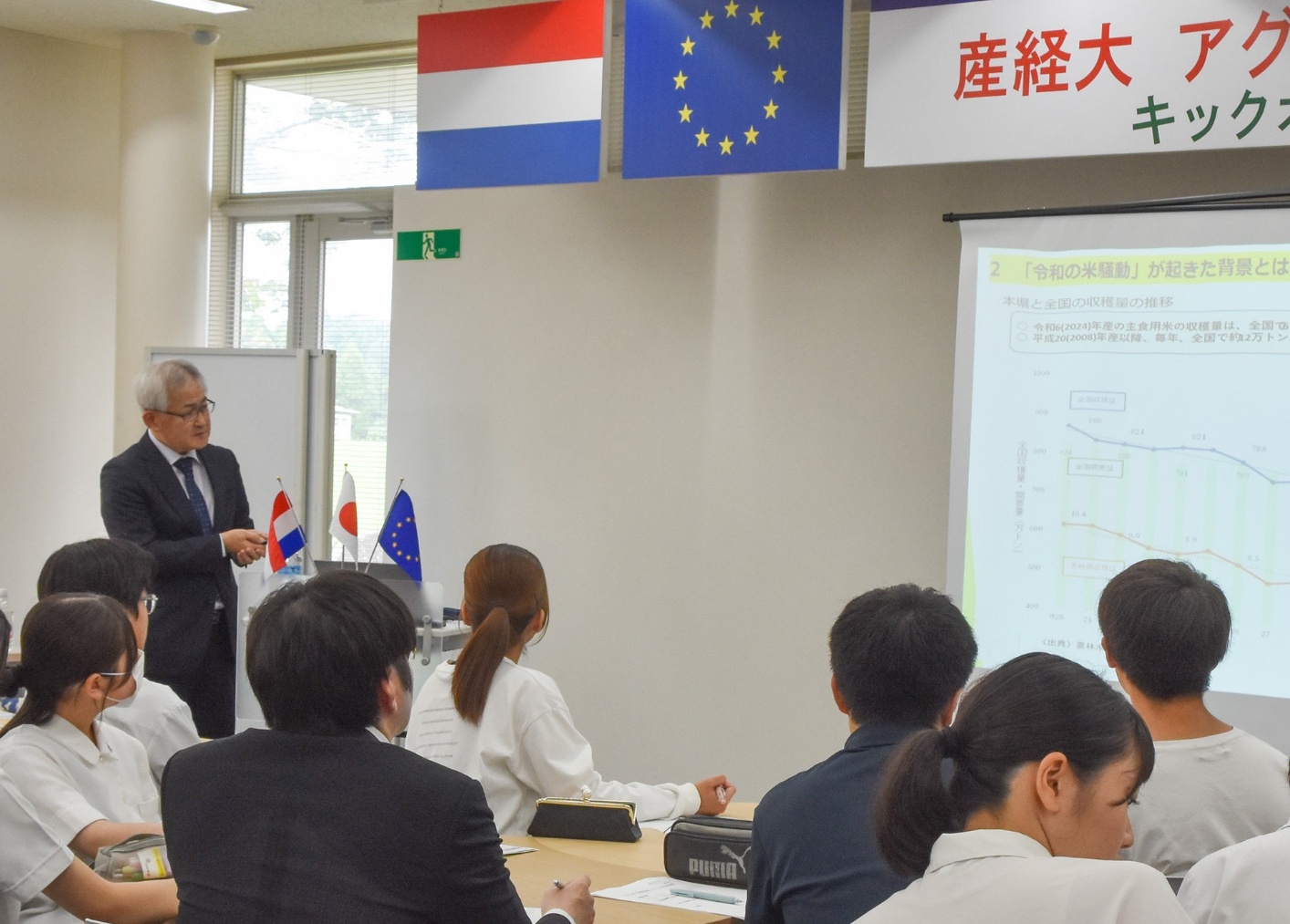 今回のテーマは「次世代へつなぐアグロ・イノベーション」-令和の米騒動から学ぶ、価格と価値のジレンマを超える持続可能な農業-についてです。コンテストでは産経大生と県内高校生が5チームに分かれて学び、優勝チームは「遣欧青年使節団」として令和8年10月に欧州連合の講義の受講や意見交換を行うため欧州を訪問します。
