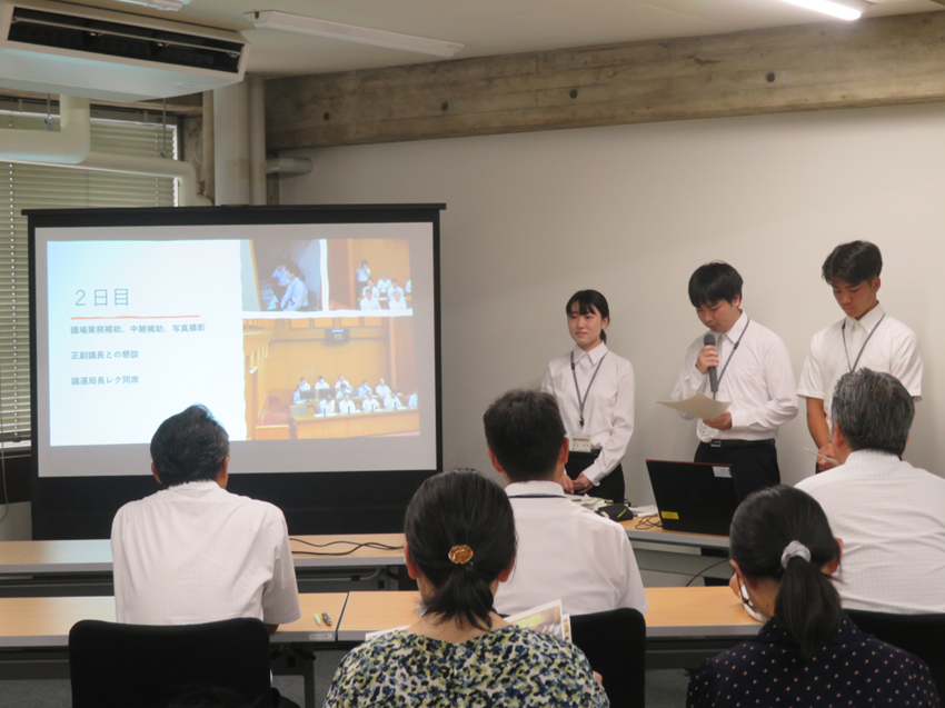 この県議会インターンシップは、個々の学生による事前の研究をふまえて、宮崎県議会事務局の方々の業務を体験させていただくというプログラムとなっています。本会議や常任委員会等での業務補助等を体験するほか、正副両議長との懇談の機会も設定され、3名の学生は、普段の学生生活では体験できない貴重な体験をすることができました。恒例の最終日の大学生によるプレゼンテーションでは、「宮崎県議会で何をやっているか、若者たちにもよりよく伝えられるようにするにはどうすればいいか」という点について、若者世代代表としての意見をプレゼンしてくれました。宮崎県議会が今年開設したXの公式アカウントでの発信をふまえた若者目線のすばらしいプレゼンでした(宮崎県議会公式X;https://x.com/miyazaki_gikai)。