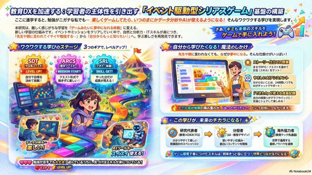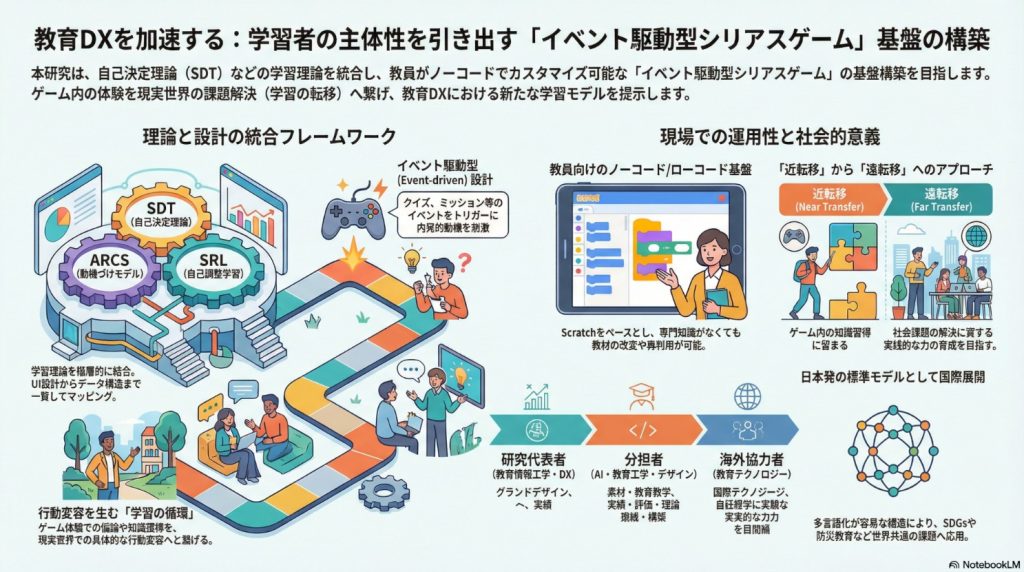 研究課題名:学習者の主体的行動を促すイベント駆動型シリアスゲーム基盤の構築と教育DXへの応用
